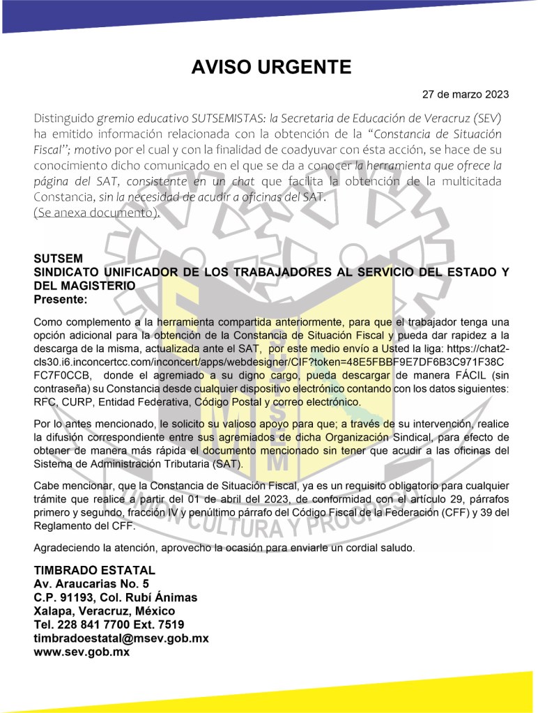 Avisos y Circulares Aviso Urgente (Constancia Situación Fiscal) Publicado por Arturoni el 28 de marzo de 202323 de junio de 2023 Comparte esto: Compartir en X (Se abre en una ventana nueva) X Comparte en Facebook (Se abre en una ventana nueva) Facebook Me gusta Cargando... Relacionado