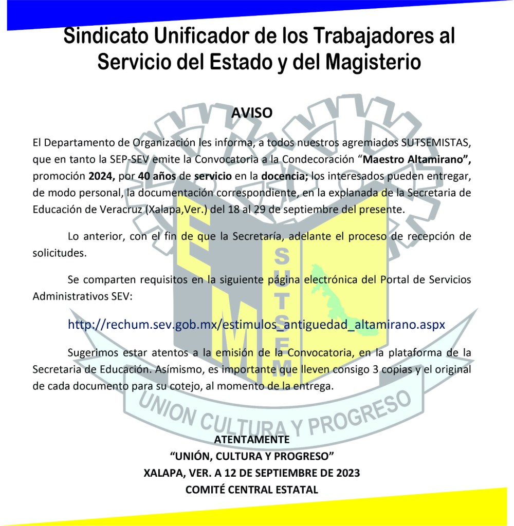 Avisos y Circulares, Organización Conmemoración por 40 años de servicio Publicado por gabosutsem el 12 de septiembre de 2023 Comparte esto: Compartir en X (Se abre en una ventana nueva) X Comparte en Facebook (Se abre en una ventana nueva) Facebook Me gusta Cargando... Relacionado